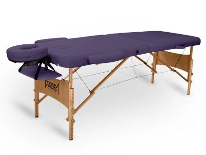Skládací masážní stůl TANDEM Basic-2 v fialové barvě má poškozené čalounění. Poškození je vidět v galerii na přiložených detailních fotografiích.