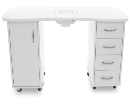 Stůl na manikúru Azzurro 2027 s odsávačkou v bílé barvě má škrábance na skříňce a poškození na pracovní desce. Poškození je vidět v galerii na přiložených detailních fotografiích.