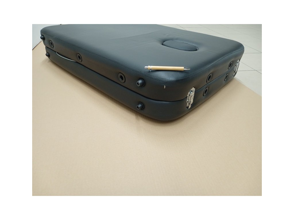 Skládací masážní stůl TANDEM Profi A2D v černé barvě byl používán v masérské škole. Na čalounění jsou mírné skvrny a praskliny u otvoru na obličej, na rohu lehátka je jedna tržná ranka. Poškození je vidět v galerii na přiložených detailních fotografiích.