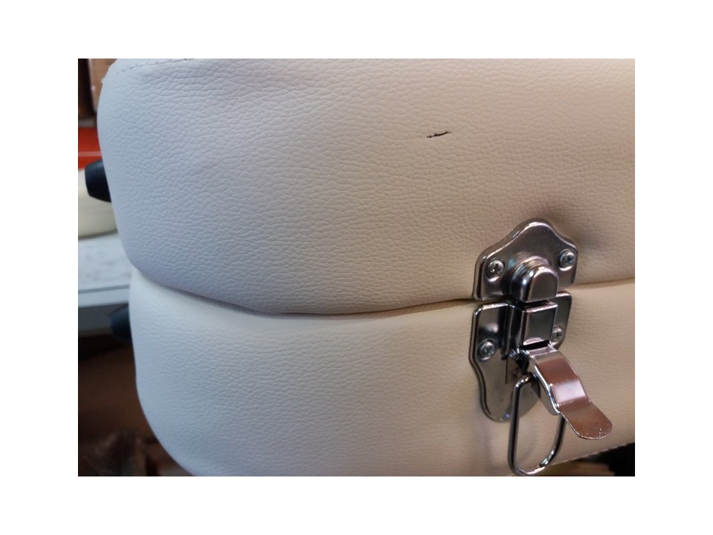 Skládací masážní stůl TANDEM Profi A2D v krémové barvě má má řeznou ránu na rohu stolu a tržnou ránu na vnitřním čalounění. Taška na přenášení je mírně znečištěna. Poškození je vidět v galerii na přiložených detailních fotografiích.