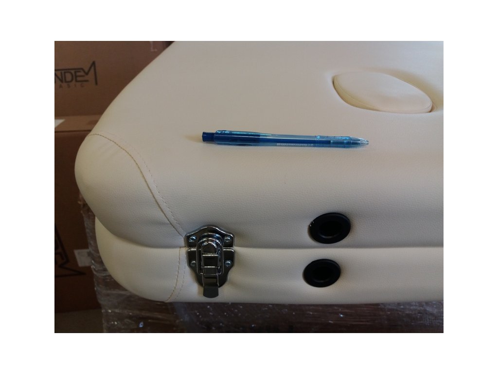 Skládací masážní stůl TANDEM Basic-2 v krémové barvě má drobné poranění na čalounění. Poškození je vidět v galerii na přiložených detailních fotografiích.