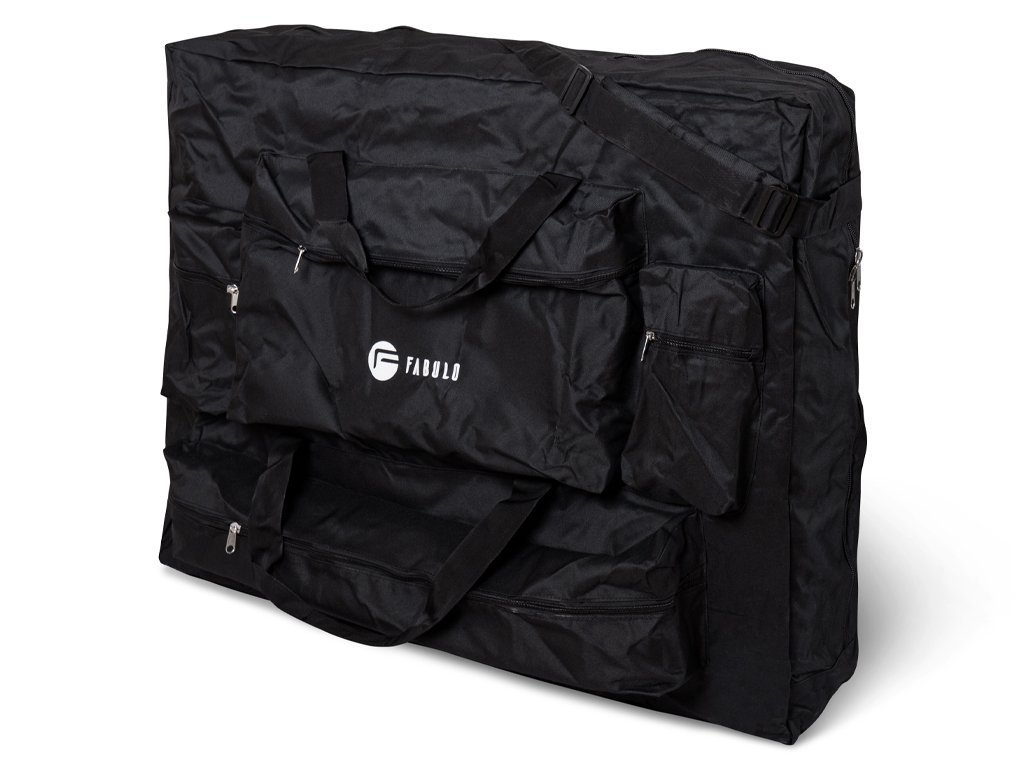 - Polstrovaná přenosná taška Deluxe s úchytkami a nastavitelným ramenním popruhem je vybavena čtyřmi kapsami pro pohodlné uložení masážních pomůcek jako jsou válec, prostěradlo nebo masážní oleje. Zpevněné dno tašky zabraňuje proděravění od nožiček stolu, což bývá častým problémem u tašek levných lehátek.