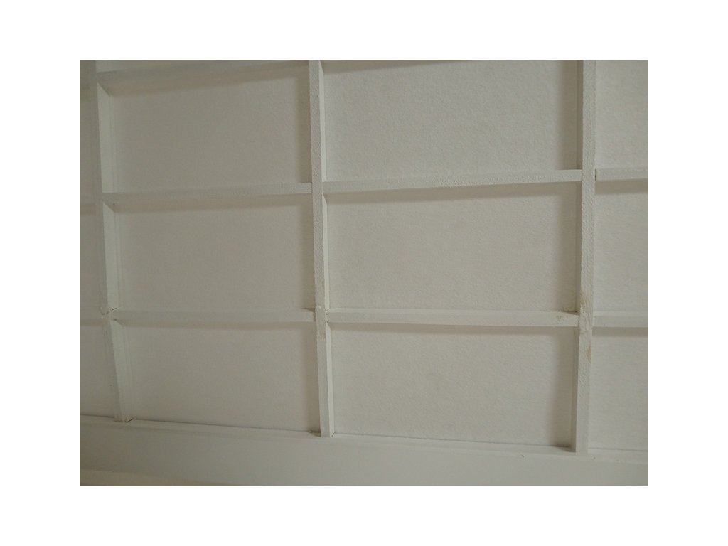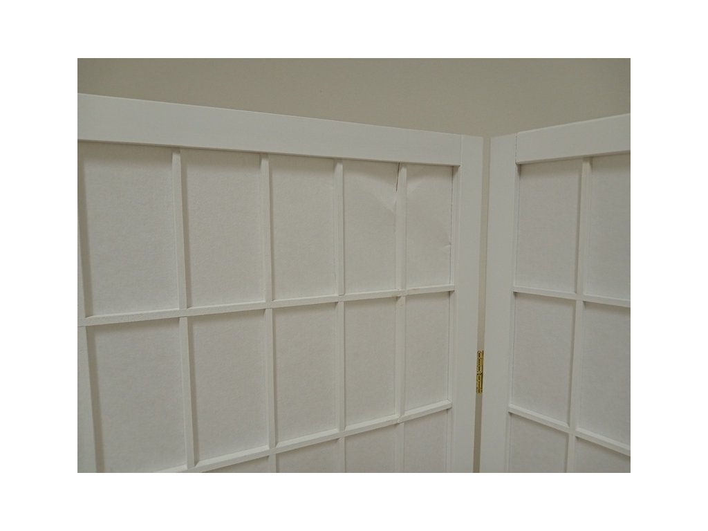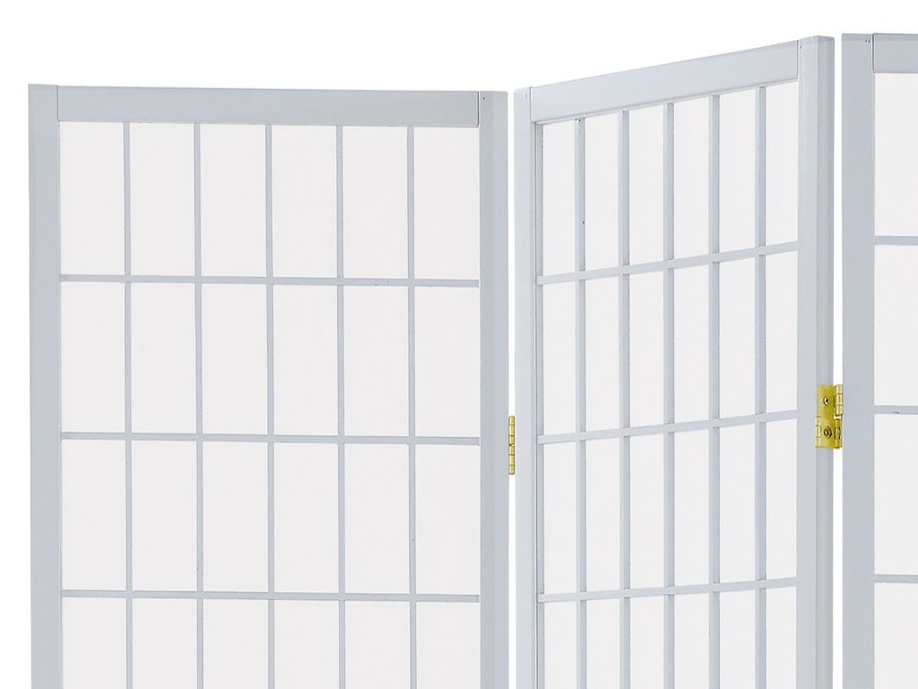 Dřevěný paravan ACRON 3-dílný v bílé barvě má poškozenou konstrukci i výplň. Poškození je vidět v galerii na přiložených detailních fotografiích.