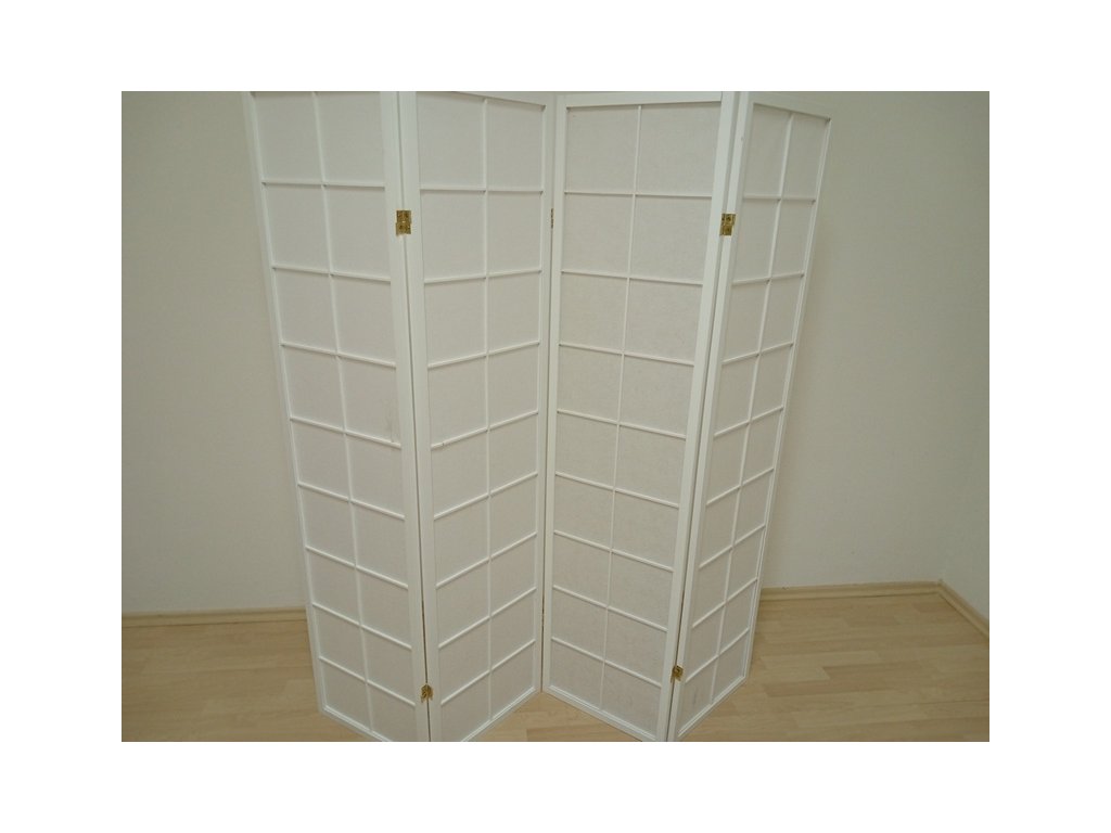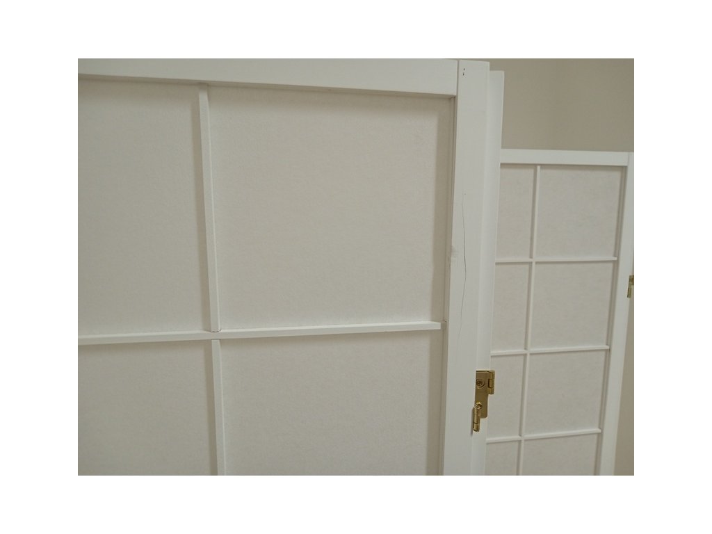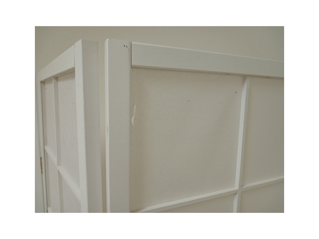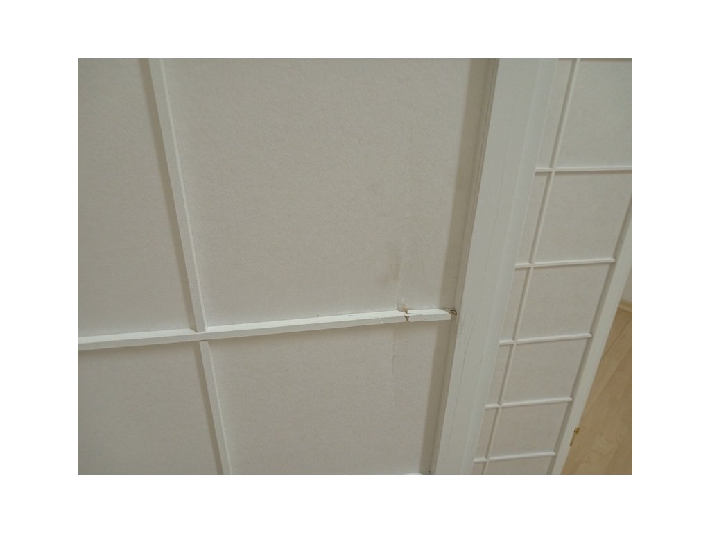 Dřevěný paravan ACRON 4-dílný v bílé barvě má poškozenou konstrukci a výplň. Poškození je vidět v galerii na přiložených detailních fotografiích.