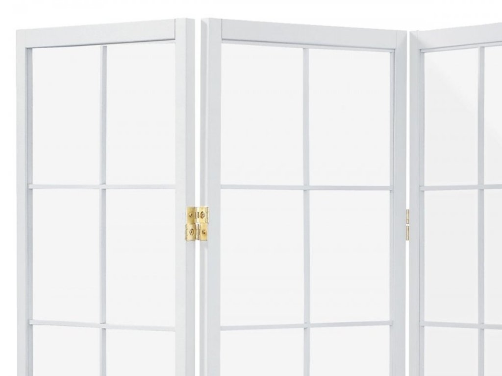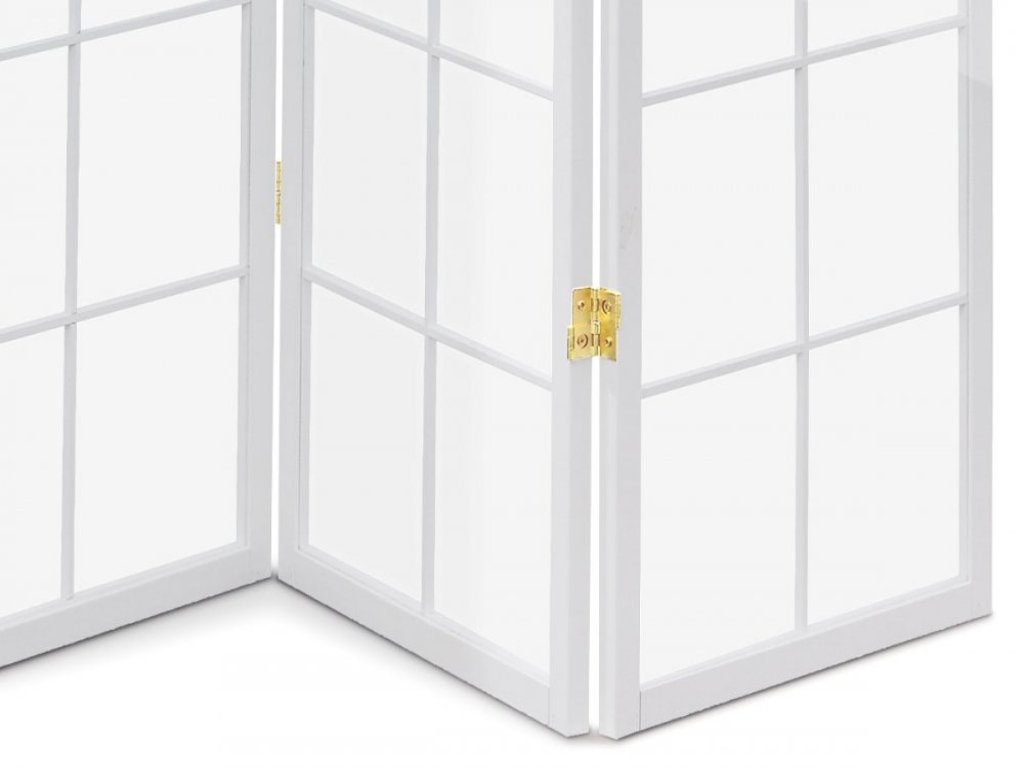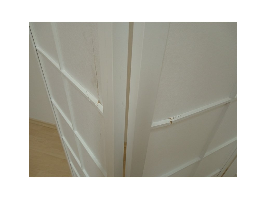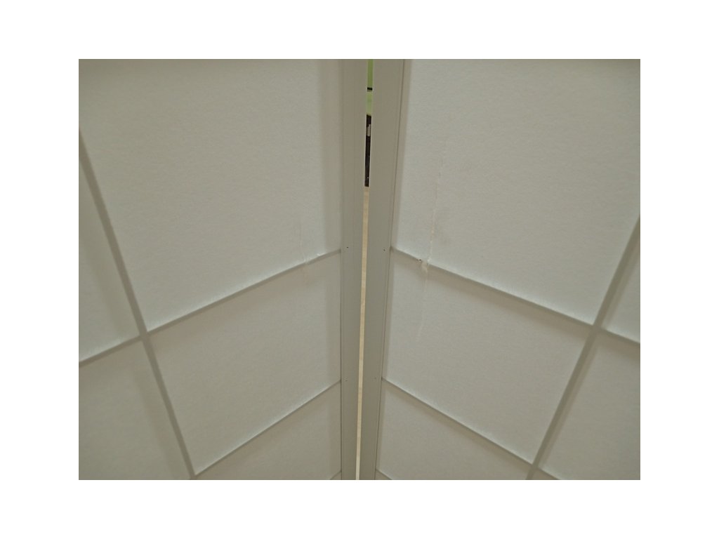 Dřevěný paravan ACRON 4-dílný v bílé barvě má poškozenou konstrukci a výplň. Poškození je vidět v galerii na přiložených detailních fotografiích.