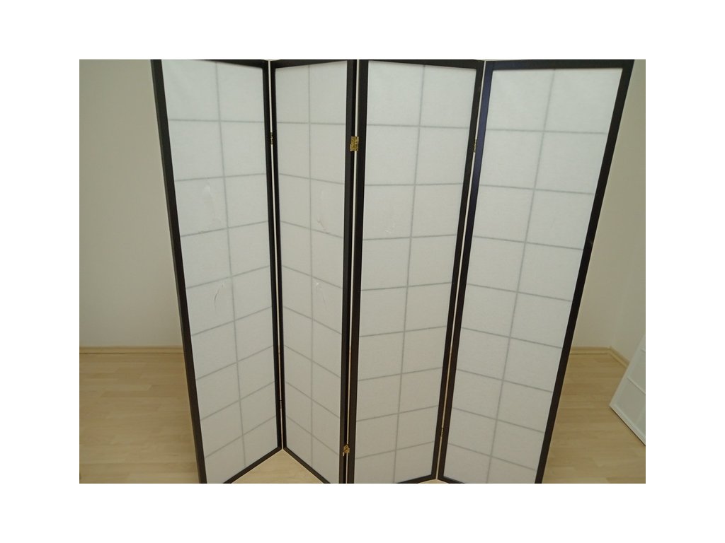 Dřevěný paravan ACRON 4-dílný v černé barvě má poškozenou konstrukci a výplň. Poškození je vidět v galerii na přiložených detailních fotografiích.