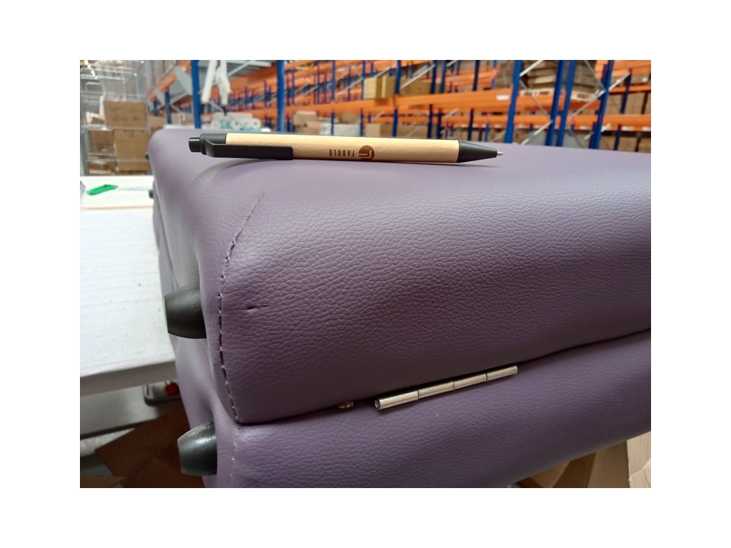 Skládací masážní stůl TANDEM Basic-2 v fialové barvě má poškozené čalounění. Poškození je vidět v galerii na přiložených detailních fotografiích.