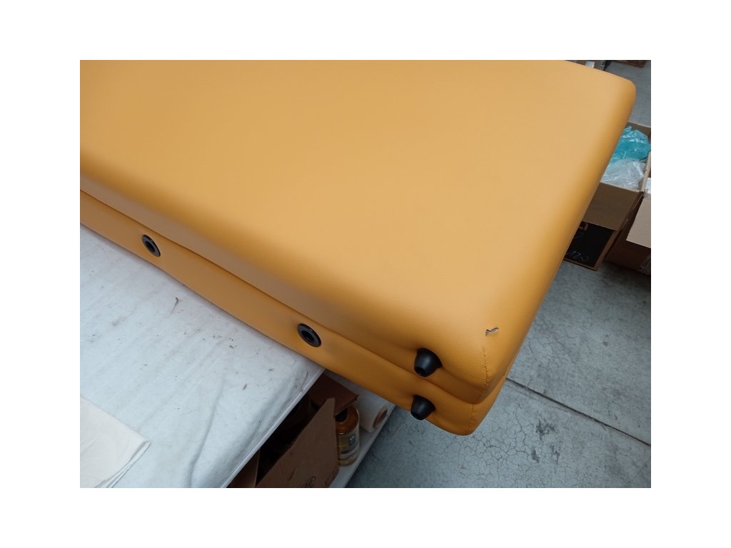 Skládací masážní stůl TANDEM Basic-2 v broskvové barvě má tržnou ránu na rohu lehátka. Poškození je vidět v galerii na přiložených detailních fotografiích.