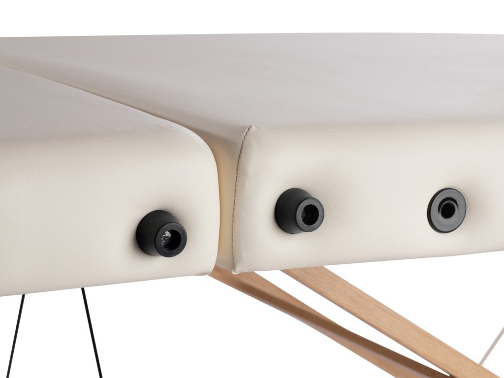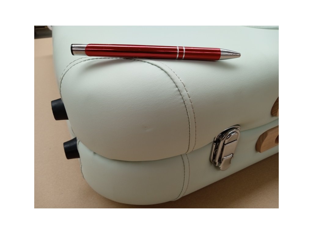 Skládací masážní stůl Fabulo UNO Set v krémové barvě má na čalounění řeznou ránu. Poškození je vidět v galerii na přiložených detailních fotografiích.