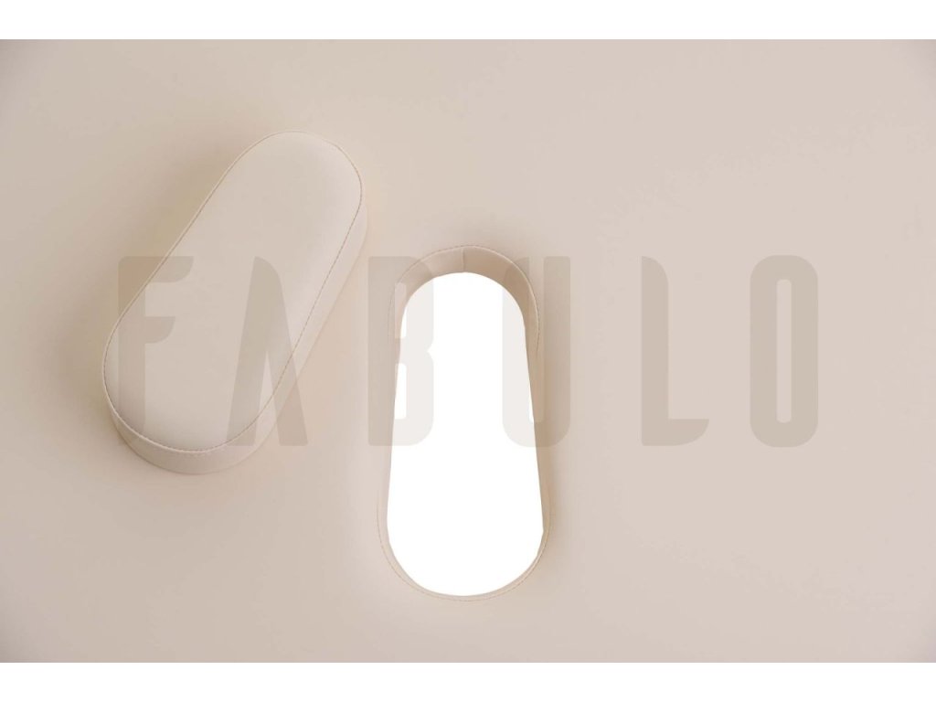 Skládací masážní stůl Fabulo GURU Set v krémové barvě má výrobní vadu na čalounění. Poškození je vidět v galerii na přiložených detailních fotografiích.