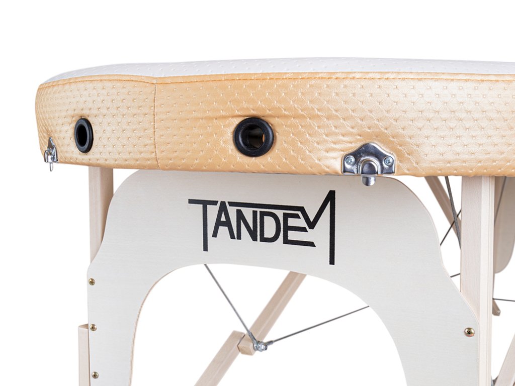 Profesionální skládací masážní stůl Tandem Profi W2D Oval Contour Duo s nosností až 350 kg, výjimečně pohodlný a stabilní, ideální pro maséry a fyzioterapeuty. Oválný design, kvalitní PU čalounění a nastavitelná výška zaručují komfort a flexibilitu při práci. Díky promyšlenému designu poskytuje terapeutovi optimální přístup ke klientovi.