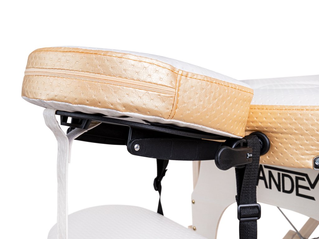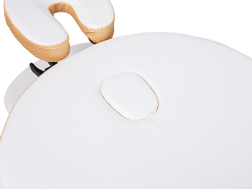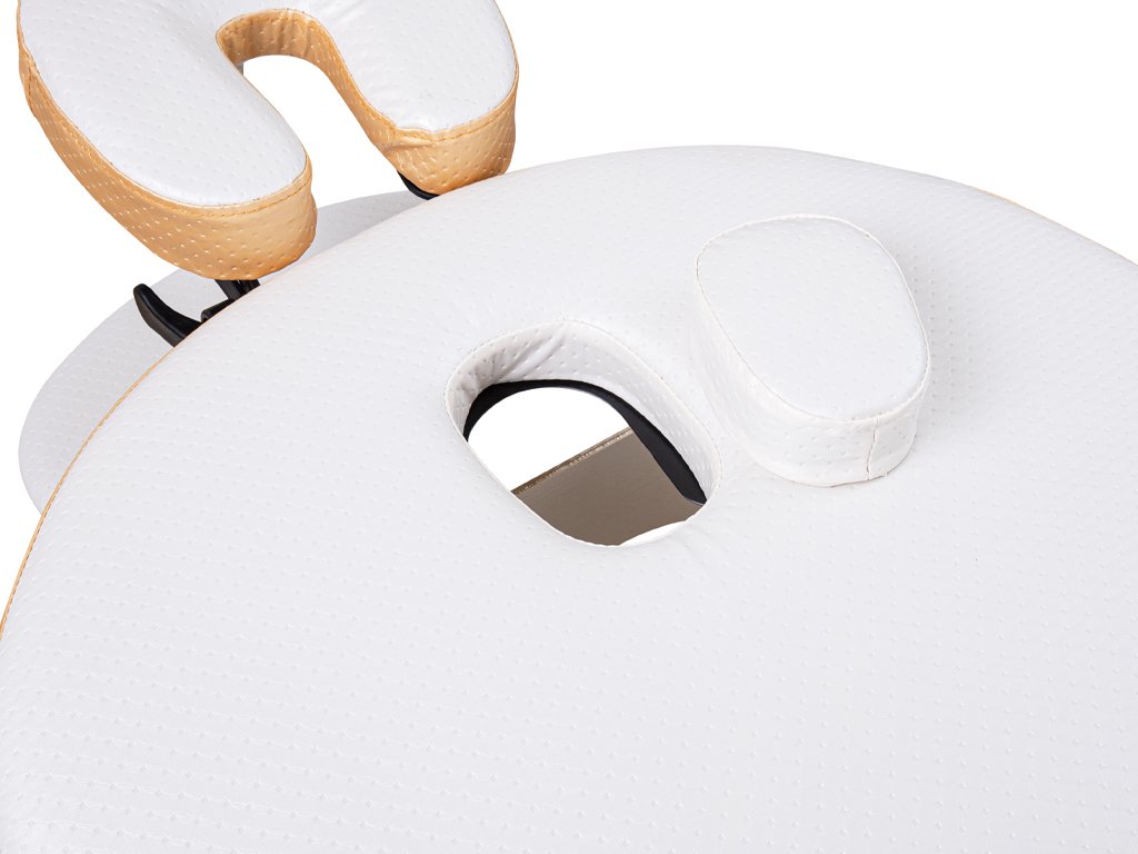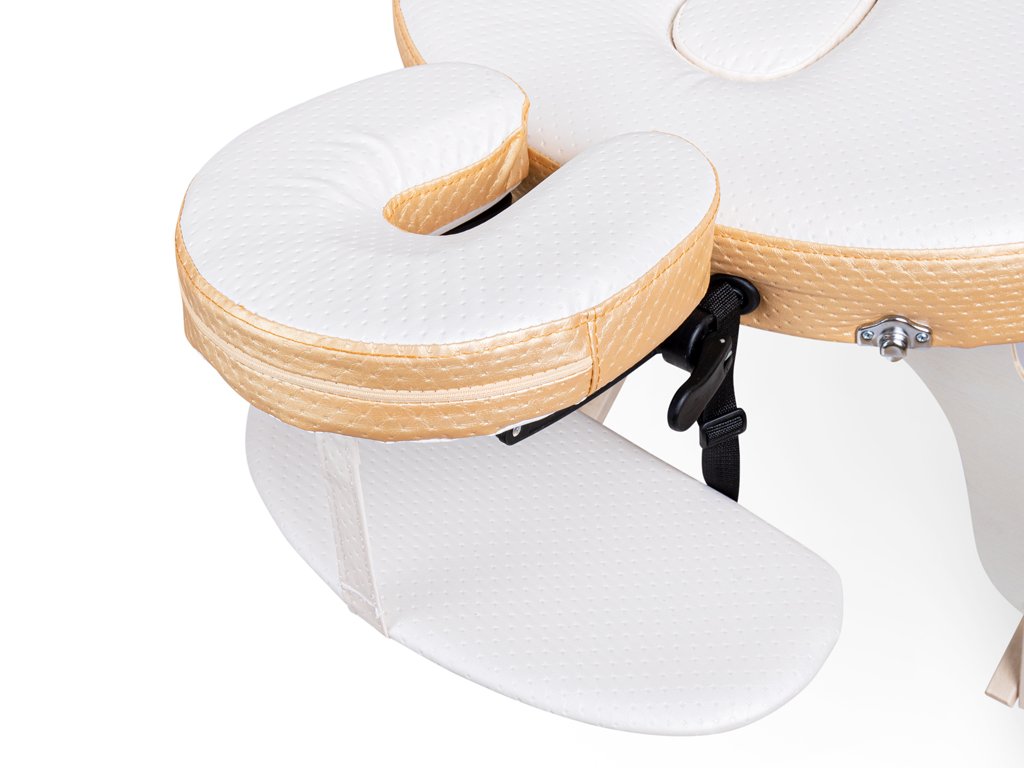 Komfort během celé terapie zajišťuje 5 cm silné polstrování potažené kvalitním PU čalouněním se strukturovaným povrchem, které je příjemné na dotek, odolné vůči masážním olejům a jednoduše udržovatelné. Praktický otvor na obličej se zátkou zvyšuje pohodlí klienta při ležení v poloze na břiše. Nastavitelný ergonomický podhlavník s polštářkem ve tvaru „U“ pohodlně podpírá hlavu klienta, umožňuje důkladnou masáž krku a zároveň rozšiřuje využitelnou plochu lehátka až na 222 cm, což je ideální i pro vyšší klienty.