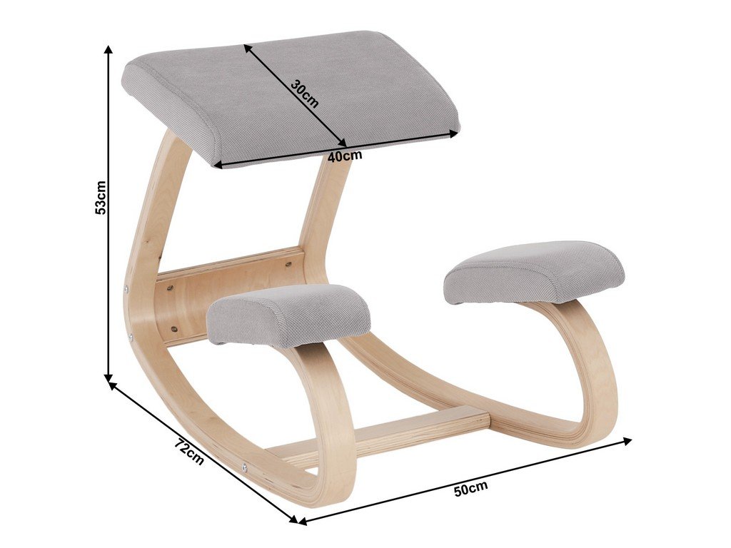 Pevný dřevěný rám zajišťuje stabilitu a látkové čalounění komfort a dokonalé pohodlí i při delším sezení. Svou výškou 53 cm, šířce 50 cm a hloubkou 72 cm je balanční klekačka dostatečně robustní, ale přitom s ní lze snadno manipulovat.