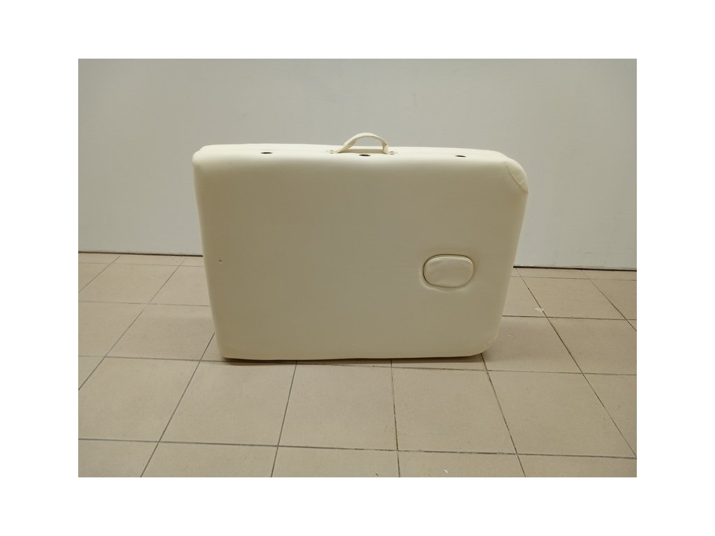Skládací masážní stůl TANDEM Basic-2 v krémové barvě má malou dírku na čalounění. Poškození je vidět v galerii na přiložených detailních fotografiích.