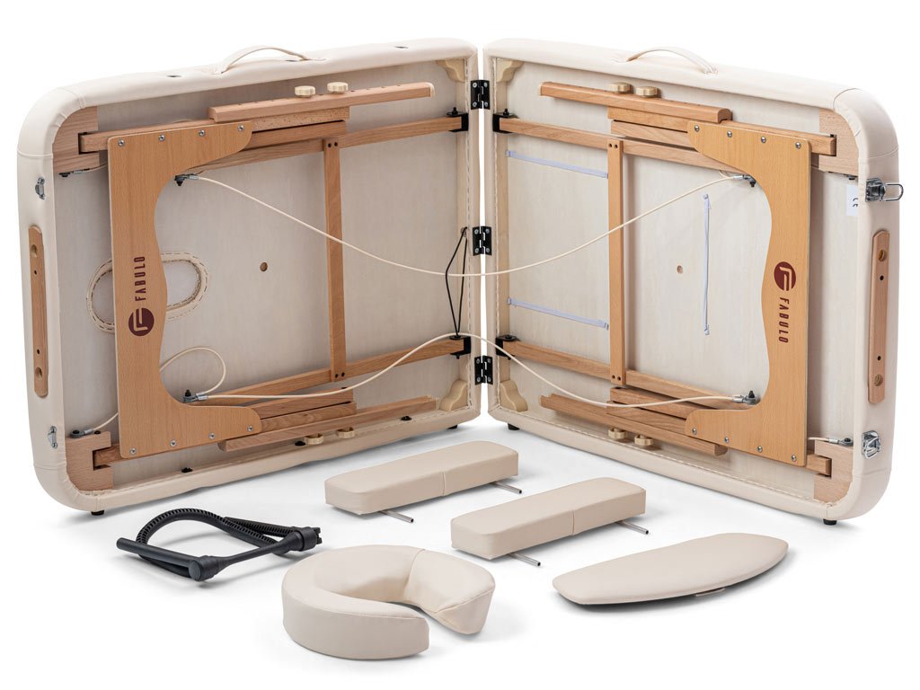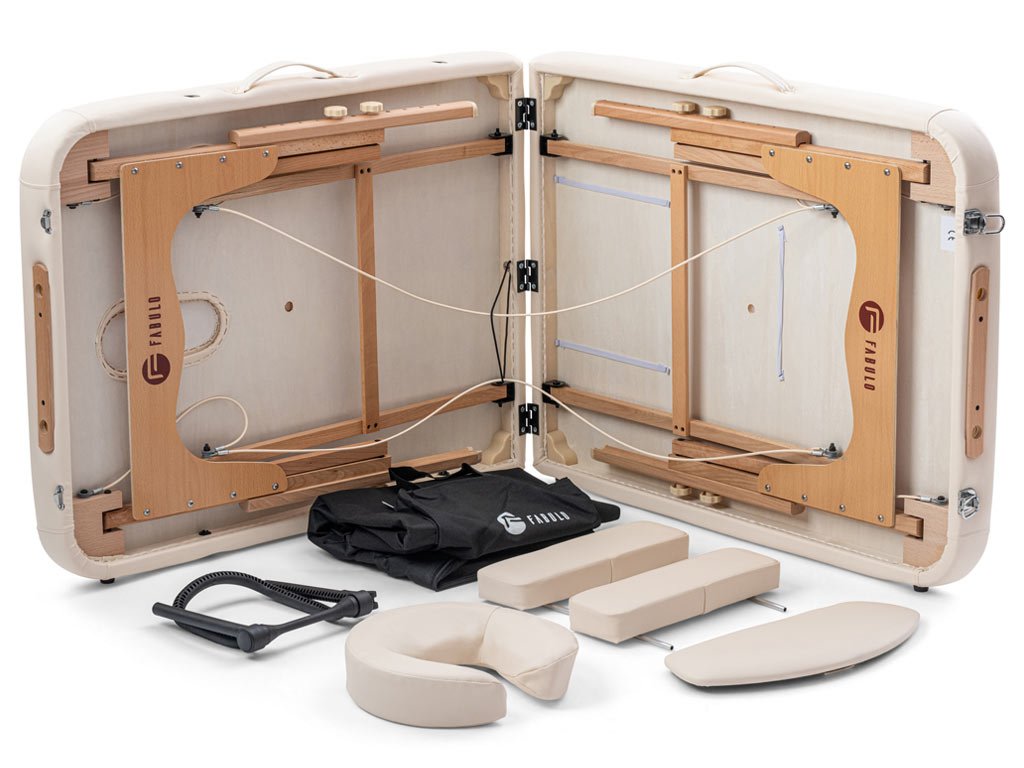 Profesionální dřevěné dvoudílné skládací masážní lehátko Fabulo UNO Set je určeno především masérům, fyzioterapeutům a pracovníkům v oblasti beauty a wellness průmyslu. Přestože je masážní lehátko skládací, díky jeho stabilitě ho vřele doporučujeme i jako stabilní vybavení masážních salonů. Přenosné masážní lehátko Fabulo Uno Set je velmi praktické, systém lanek zajišťuje jeho rychlé složení a rozložení, proto je vhodné pro maséry, kteří pravidelně cestují za zákazníky. Masážní lehátko dodáváme spolu s příslušenstvím, které lze uschovat uvnitř lehátka.