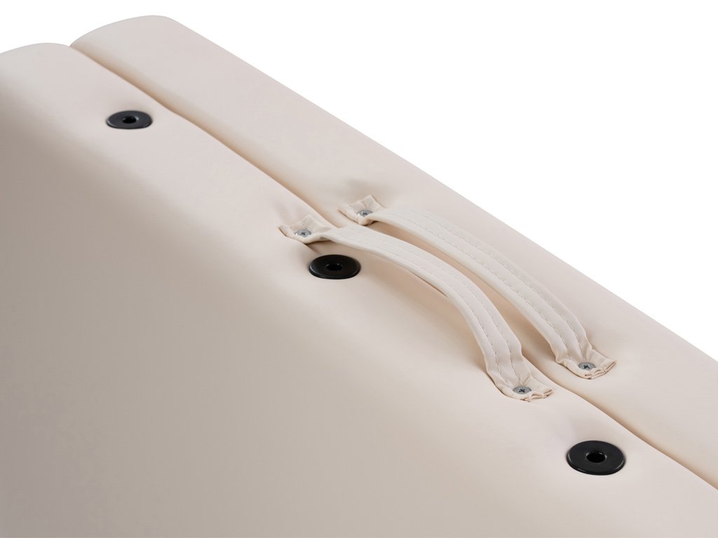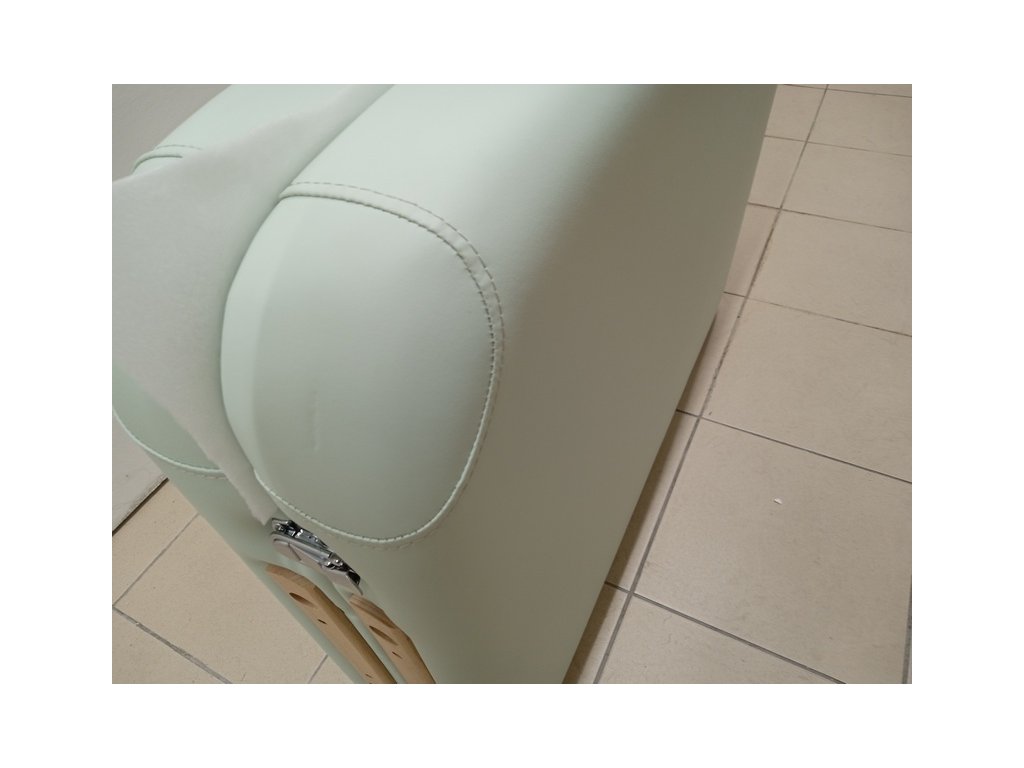 Skládací masážní stůl Fabulo UNO Set v krémové barvě má drobné poranění na čalounění. Poškození je vidět v galerii na přiložených detailních fotografiích.