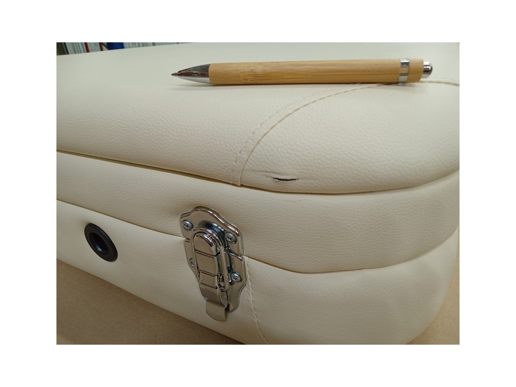 Skládací masážní stůl TANDEM Basic ALU-3 v krémové barvě má 2 řezné rány na čalounění. Poškození je vidět v galerii na přiložených detailních fotografiích.