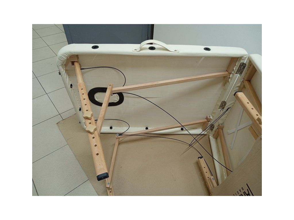 Skládací masážní stůl TANDEM Basic-2 v krémové barvě má zlomenou překližku a malou dírkou na opěrce hlavy. Před používáním je nutná oprava!!! V balení chybí boční opěrky rukou. Poškození je vidět v galerii na přiložených detailních fotografiích.